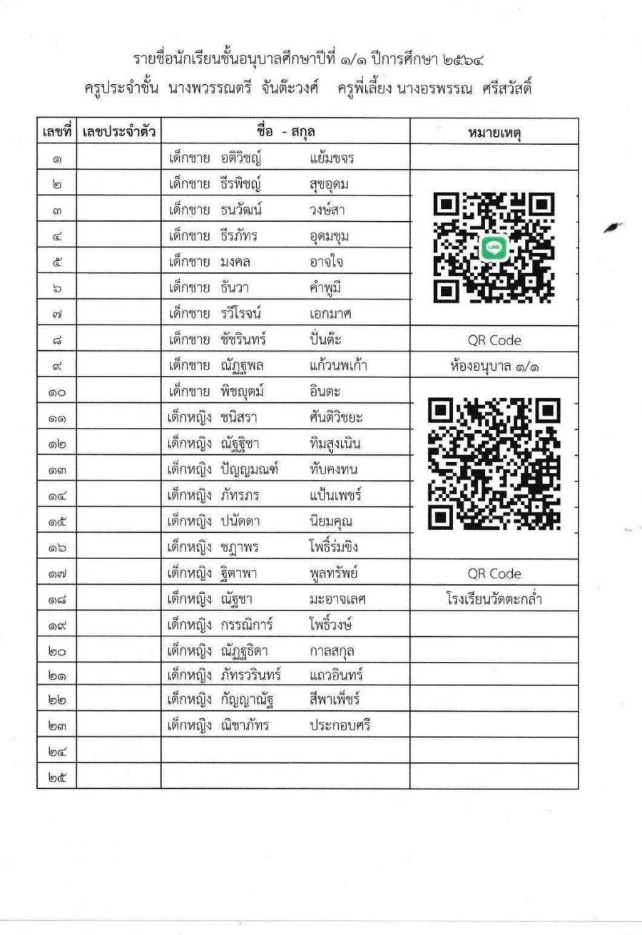 รายชื่อนักเรียนสายชั้นอนุบาล 1