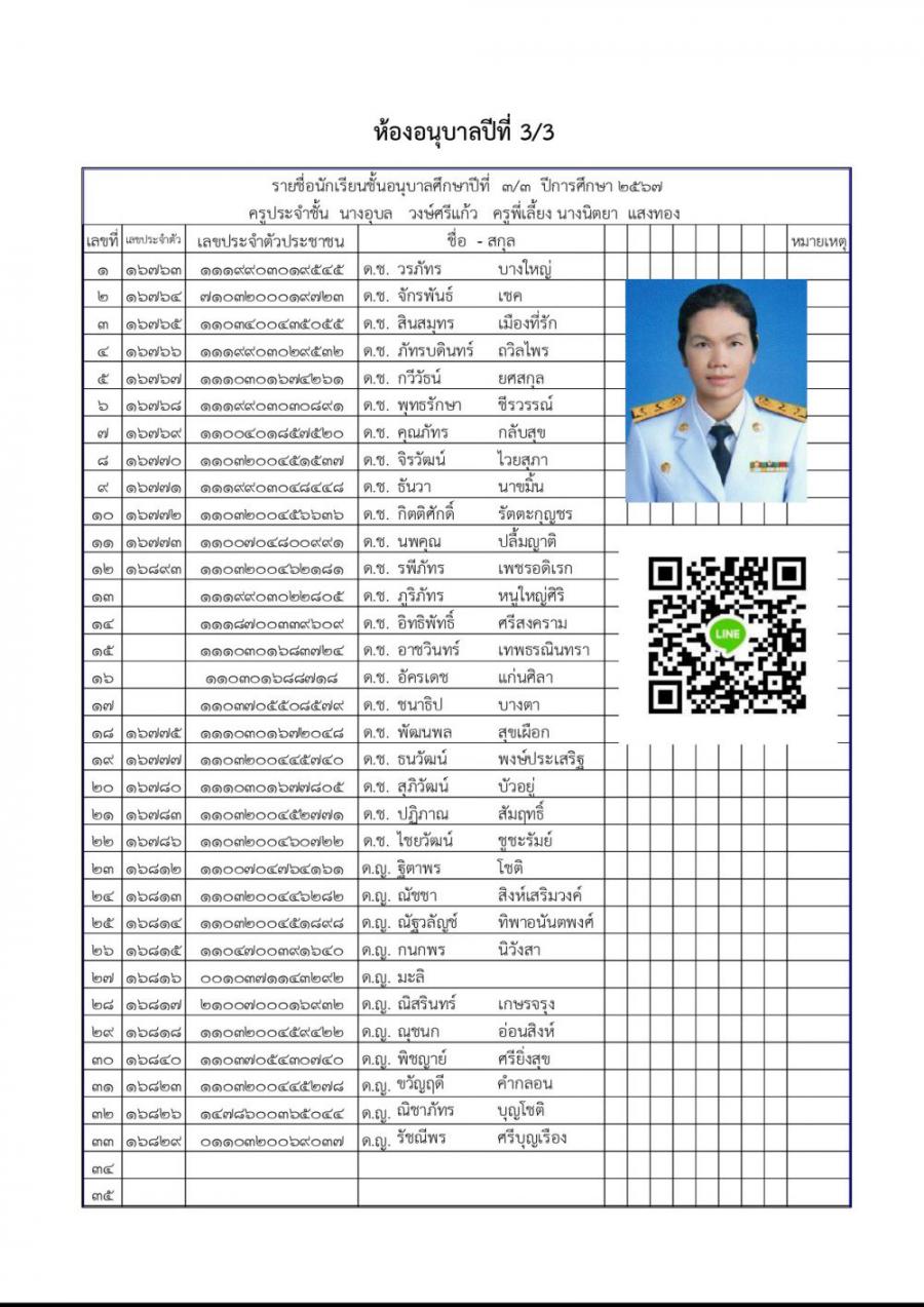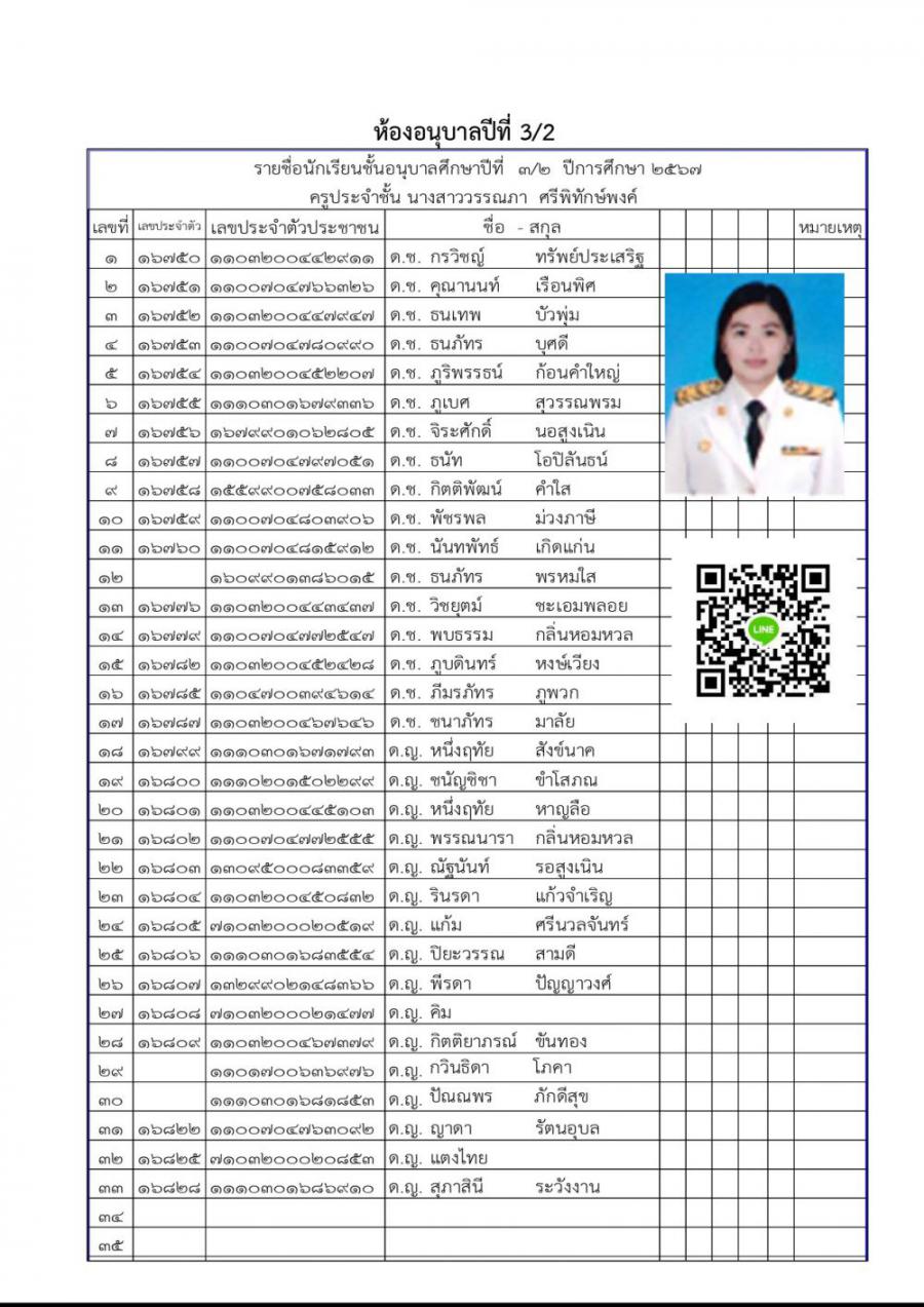 ประกาศรายชื่อนักเรียนชั้นอนุบาล 1 - 3 ปีการศึกษา 2567 กรุณาสแกน QR Code ตามใบรายชื่อห้องเรียนของนักเรียนครับ S:0
