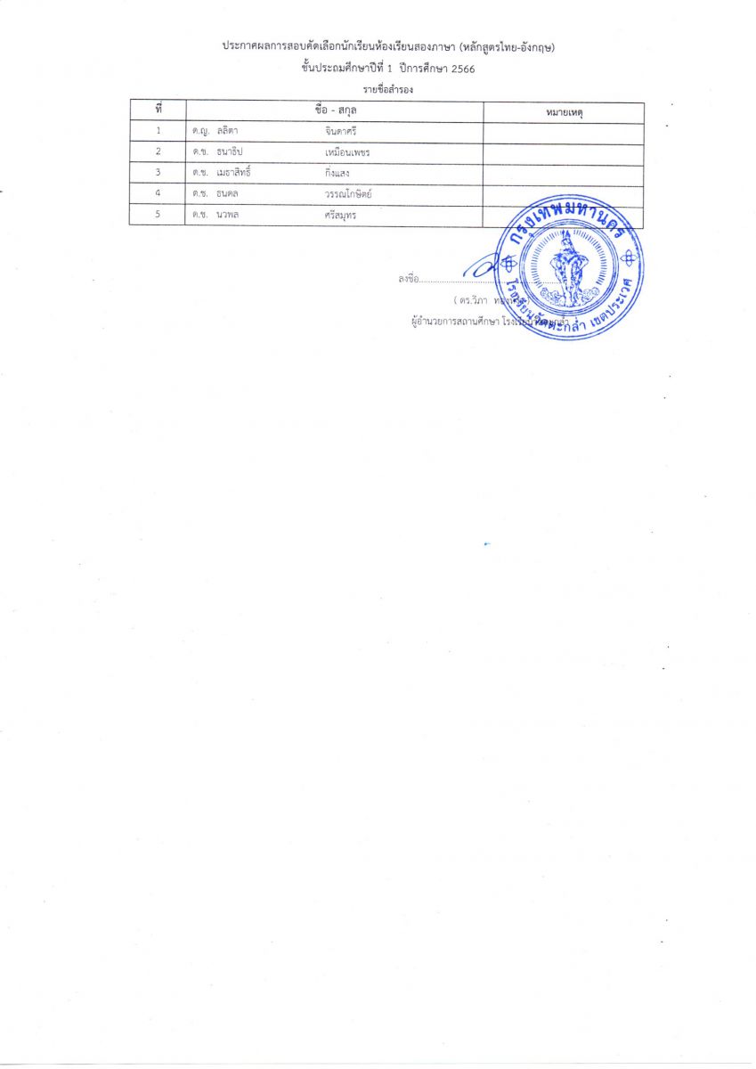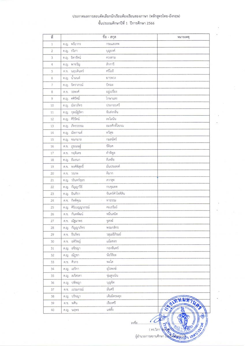 ประกาศรายชื่อนักเรียนห้องเรียนสองภาษา ป.1 ปีการศึกษา 2566