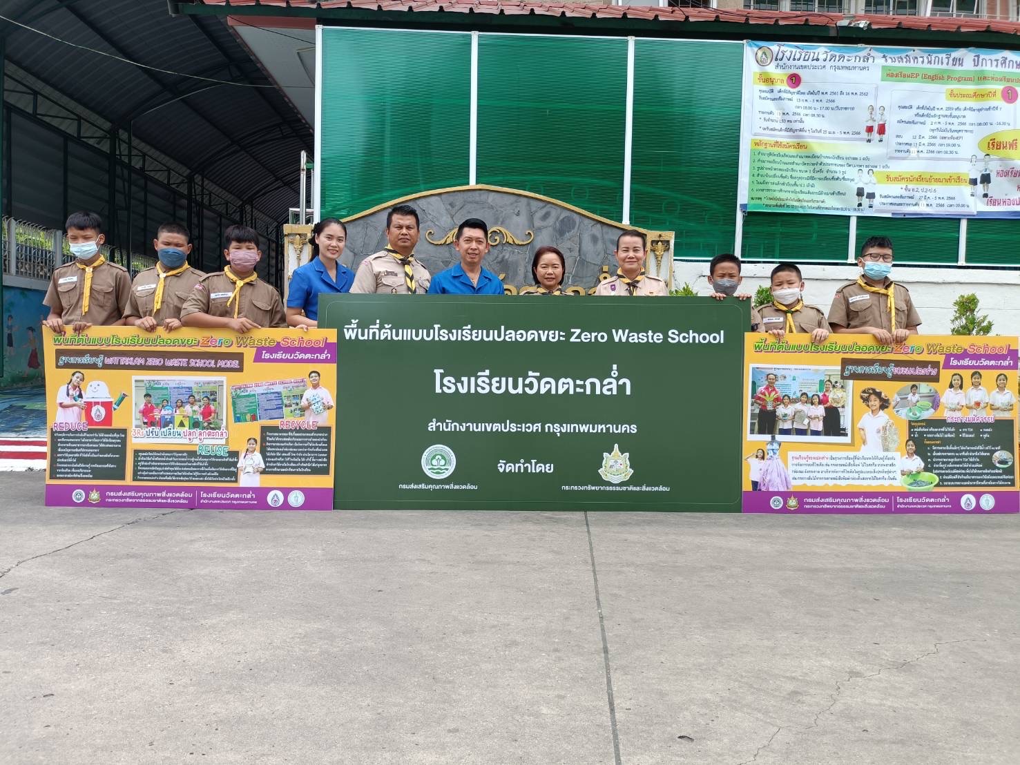 กรมส่งเสริมคุณภาพสิ่งแวดล้อม กระทรวงทรัพยากรธรรมชาติและสิ่งแวดล้อม มอบป้ายพื้นที่ต้นแบบโรงเรียนปลอดขยะ และป้ายฐานการเรียนรู้ในการจัดการขยะในโรงเรียน ให้คณะผู้บริหาร นำโดยท่านผู้อำนวยการ ดร.วิภา ทองหง
