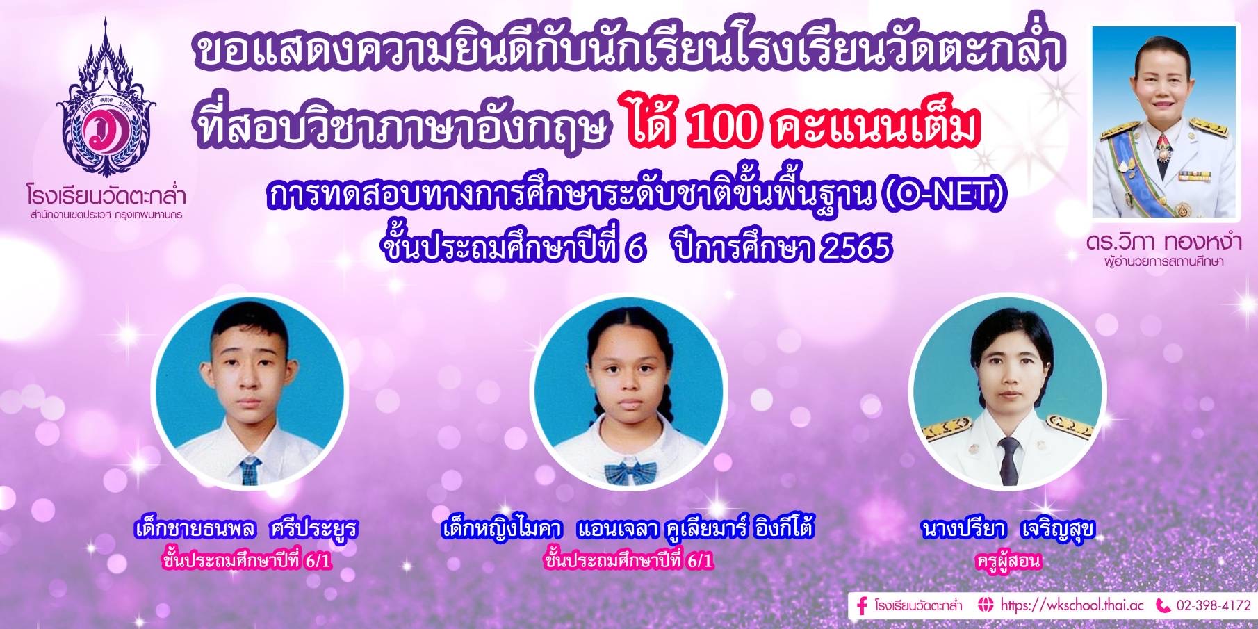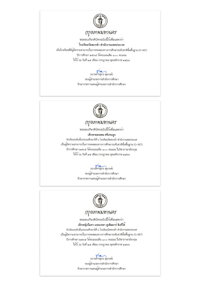 เกียรติบัตรโรงเรียนวัดตะกล่ำเป็นโรงเรียนที่มีผู้ที่มีความสามารถในการทดสอบทางการศึกษาระดับชาติขั้นพื้นฐาน (O-NET) ปีการศึกษา 2565 ได้คะแนนเต็ม 100 คะแนน จำนวน 2 ราย คือ 1) เด็กชายธนพล ศรีประยูร และเด็กหญิงไมคา แอนเจลา คูเลียร์ อิงกีโต้