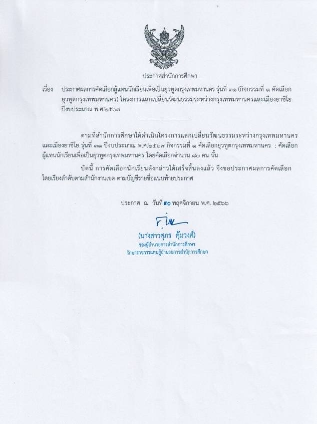 ประกาศผลการคัดเลือกผู้แทนนักเรียนเพื่อเป็นยุวทูตกรุงเทพมหานคร รุ่นที่ 31 โครงการแลกเปลี่ยนวัฒนธรรมระหว่างกรุงเทพมหานครและเมืองยาชิโย ปีงบประมาณ พ.ศ.2567