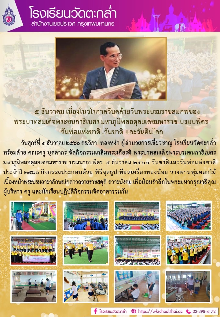 วันศุกร์ที่ 1 ธันวาคม 2566 ดร.วิภา ทองหงำ ผู้อำนวยการเชี่ยวชาญ โรงเรียนวัดตะกล่ำ พร้อมด้วย คณะครู บุคลากร จัดกิจกรรมเฉลิมพระเกียรติ พระบาทสมเด็จพระบรมชนกาธิเบศร มหาภูมิพลอดุลยเดชมหาราช บรมนาถบพิตร 5 ธันวาคม 2566 วันชาติและวันพ่อแห่งชาติ ประจำปี 2566
