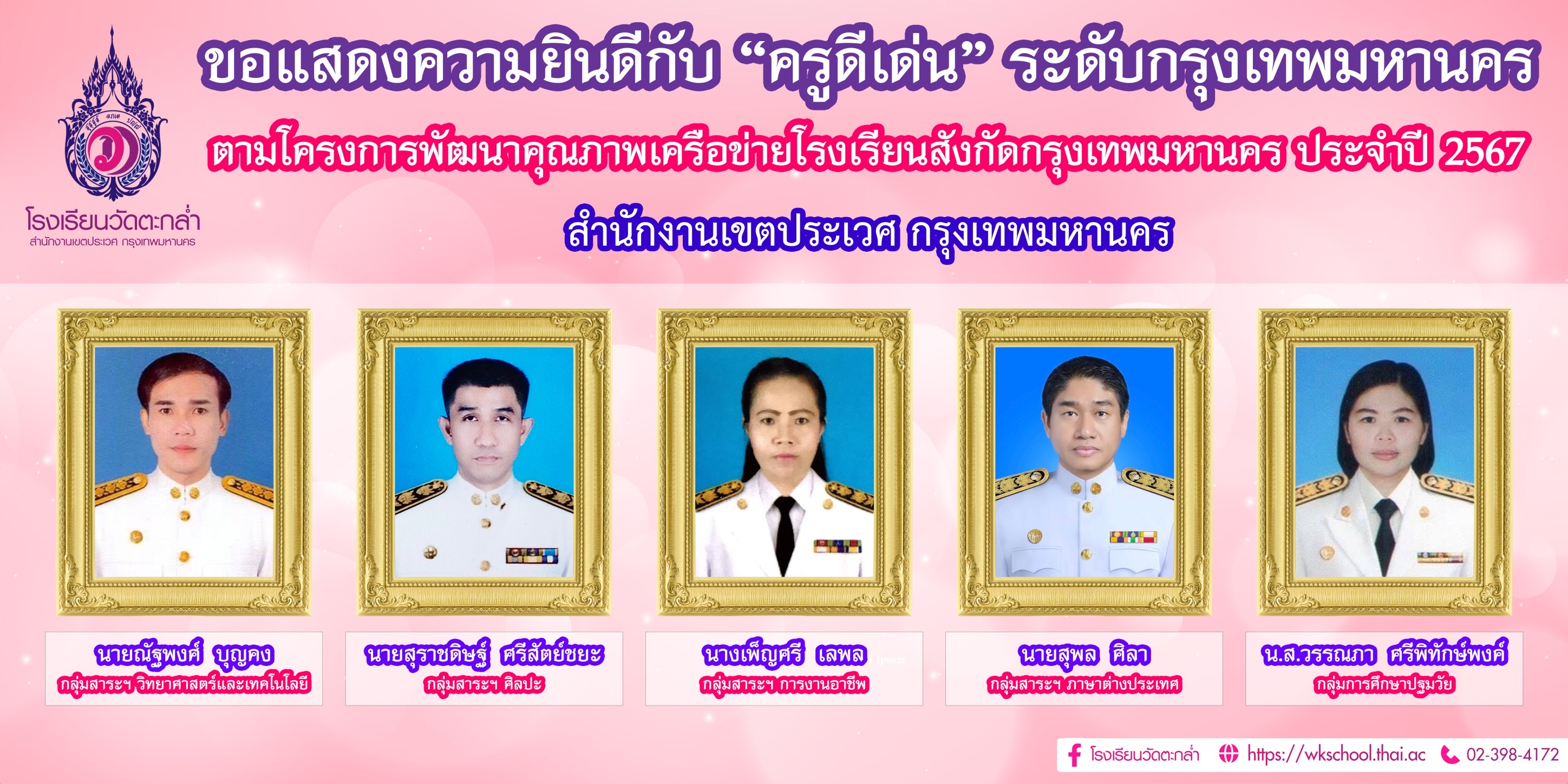 โรงเรียนวัดตะกล่ำ ขอแสดงความยินดีกับ ครูดีเด่น ระดับกรุงเทพมหานคร ตามโครงการพัฒนาคุณภาพเครือข่ายโรงเรียนสังกัดกรุงเทพมหานคร ประจำปี 2567