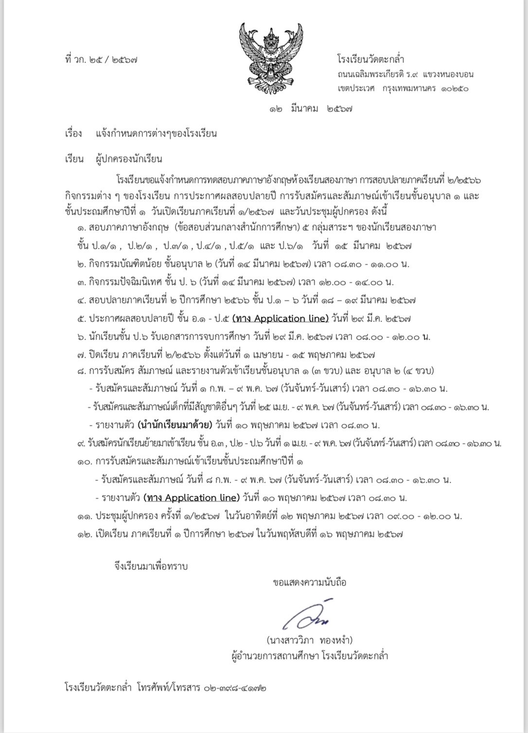 กำหนดการต่าง ๆ ของโรงเรียน