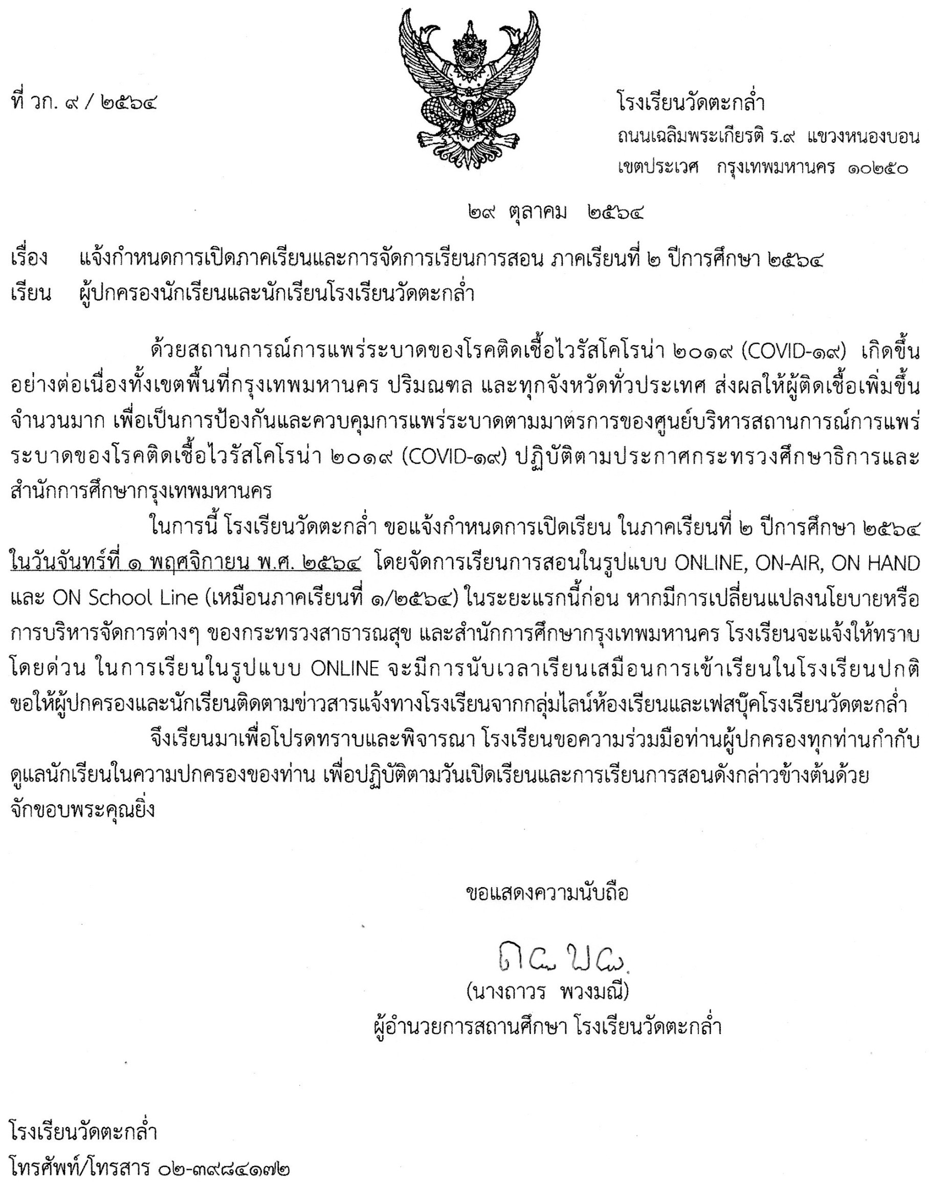 ขออนุญาตเรียนแจ้ง เรื่องกำหนดการเปิดเรียน ในภาคเรียนที่ 2/2564