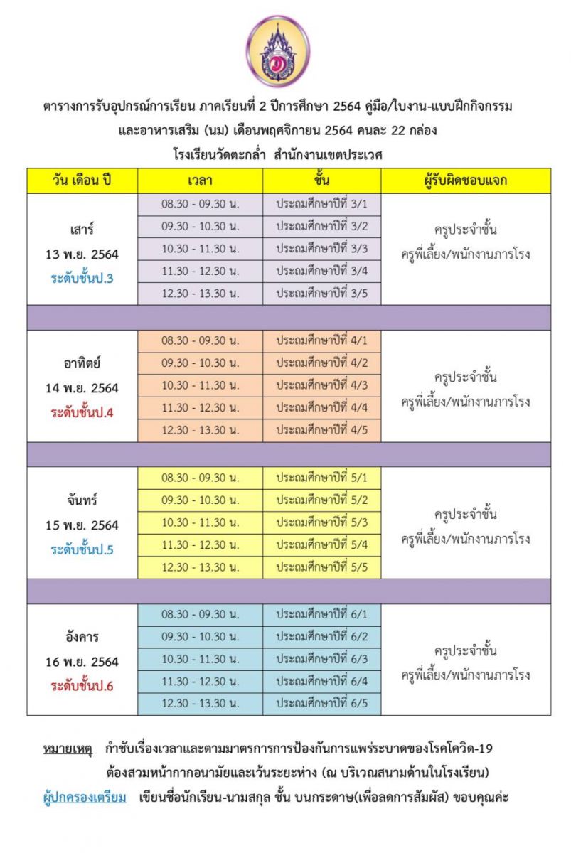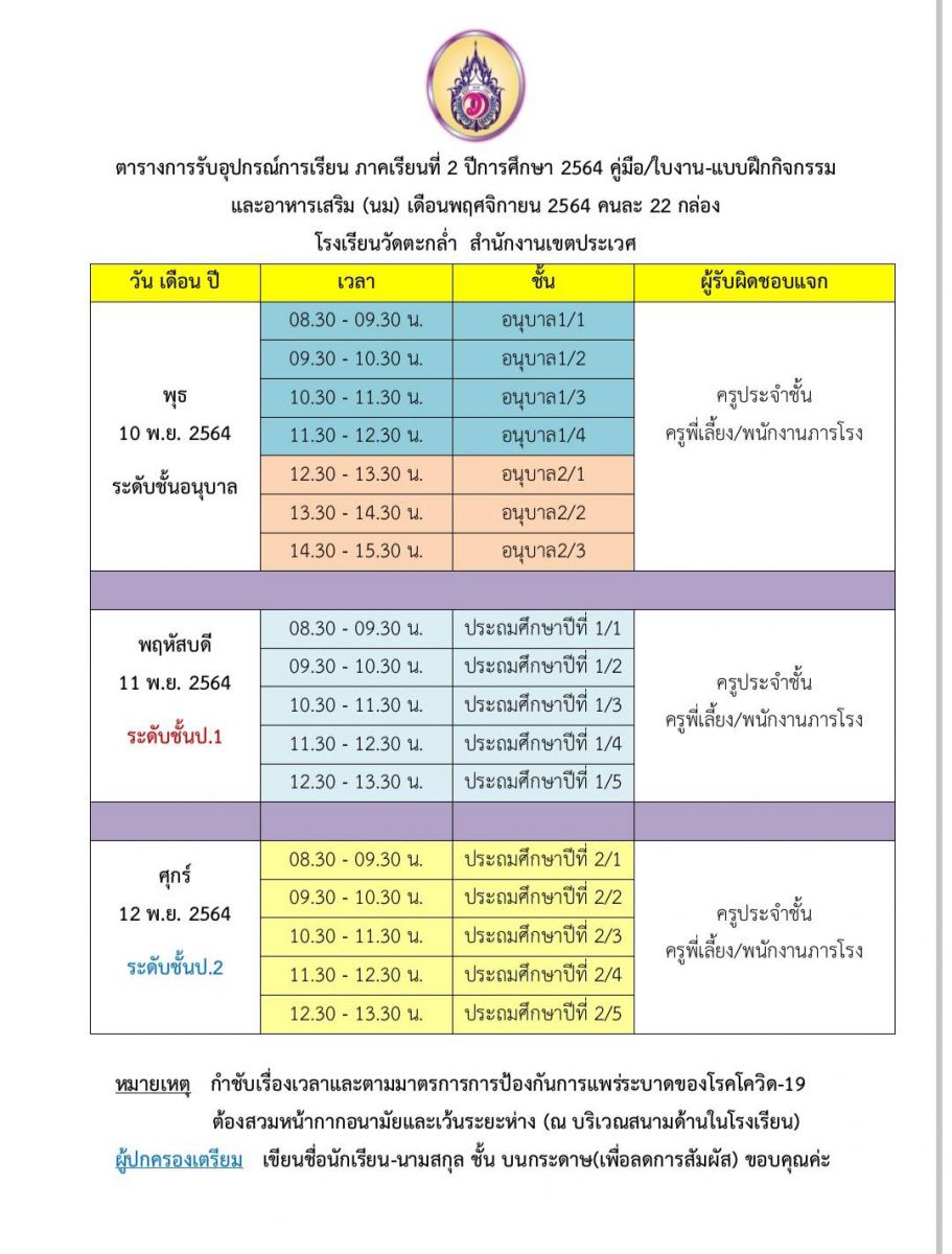 ตารางวันเวลารับอุปกรณ์การเรียนและนม