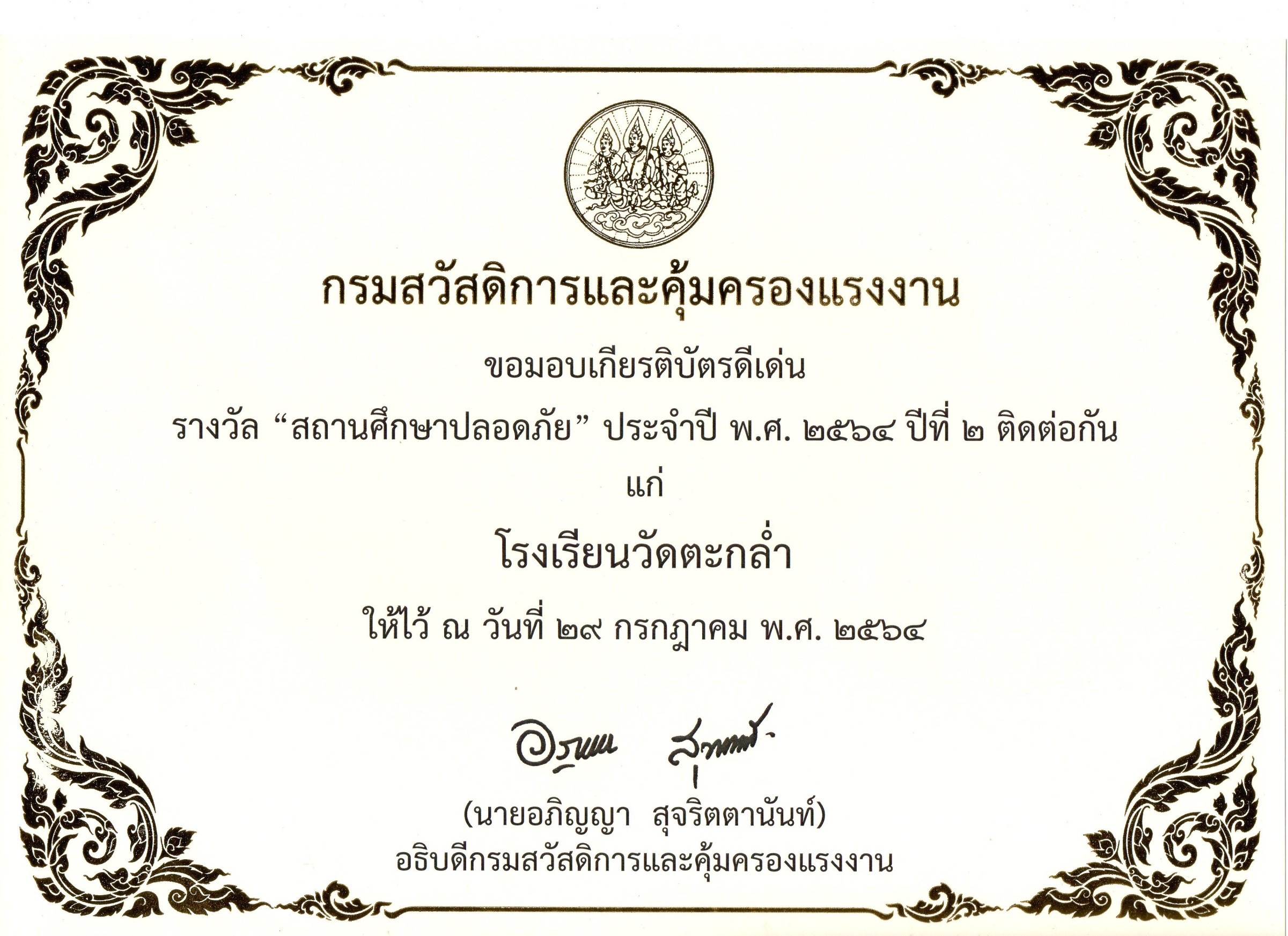 โรงเรียนวัดตะกล่ำ ได้รับรางวัลสถานศึกษาปลอดภัย ปีที่ 2