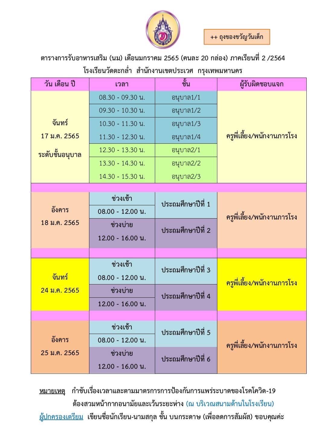วันและเวลารับนมโรงเรียน เดือน มกราคม 2565
