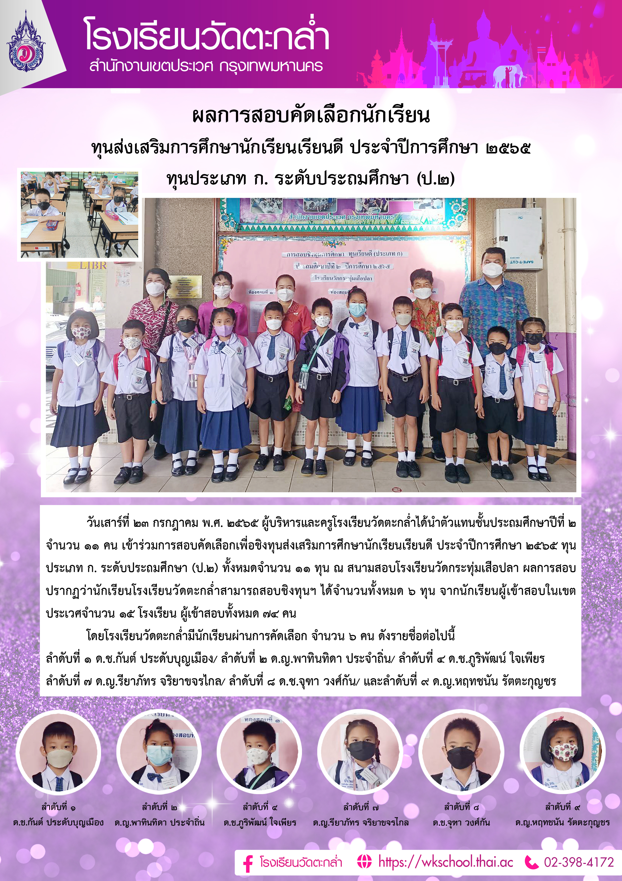 ผู้บริหาร คณะครู และบุคลากรโรงเรียนวัดตะกล่ำ ขอแสดงความยินดีกับนักเรียนตัวแทนโรงเรียนวัดตะกล่ำทั้ง 11 คน ในการสอบคัดเลือกนักเรียนทุนส่งเสริมการศึกษานักเรียนที่เรียนดี ทุนประเภท ก. ชั้นประถมศึกษาปีที่ 2 ผลการสอบของนักเรียนวัดตะกล่ำ สอบผ่านการคัดเลือกได้มา 6 ทุนจาก จำนวนทั้งหมด 11 ทุน อีก 5 คนที่เหลือก็เก่งๆกันทุกคน ชื่นชมเด็กๆทั้ง 11 คน และคุณครูผู้ให้ ผู้สั่งสอน